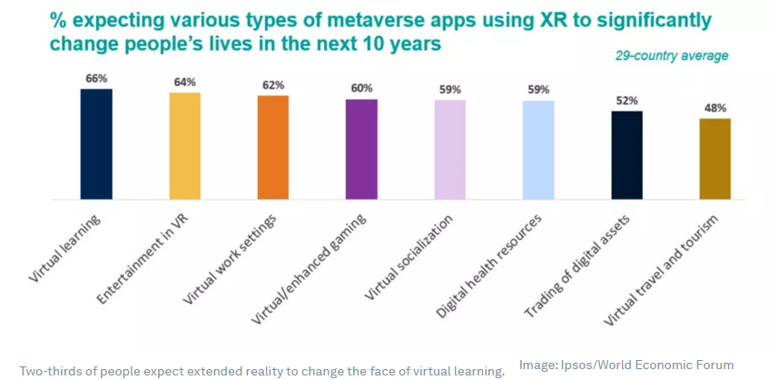 Quizás el dato más significativo es la importancia que las personas tienden a asignar a estas tecnologías; a pesar de las diferencias significativas en la familiaridad y el entusiasmo, el público mundial espera ampliamente que varios tipos de aplicaciones de metaverso que usan XR cambien significativamente la vida de las personas durante la próxima década, sobre todo aprendizaje virtual, estando de acuerdo casi dos tercios de las personas encuestadas.