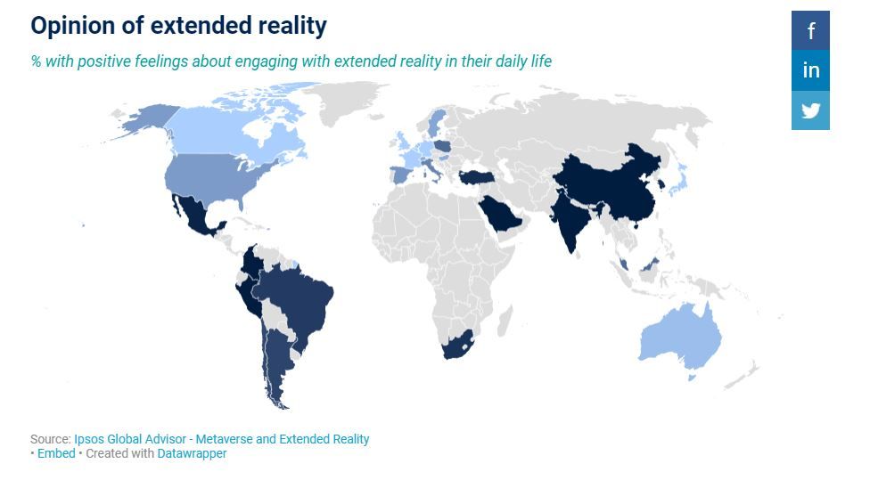 “La anticipación sobre esta nueva era de la tecnología digital es significativamente mayor en los países emergentes que en la mayoría de los países de altos ingresos. Más de dos tercios de las personas en China, India, Perú, Arabia Saudita y Colombia dicen que se sienten positivos al participar con XR, en comparación con menos de un tercio en Japón, Gran Bretaña, Bélgica, Canadá, Francia y Alemania”.
