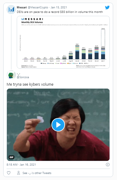 Liderados por Uniswap, los exchanges descentralizados permiten el trading anónimo donde casi cualquier persona puede proporcionar liquidez para casi cualquier token. Según Messari Research, durante enero los DEX alcanzarán 56,9 mil millones de dólares en volumen de trading. El récord anterior fue de 26,7 mil millones de dólares en septiembre de 2020.