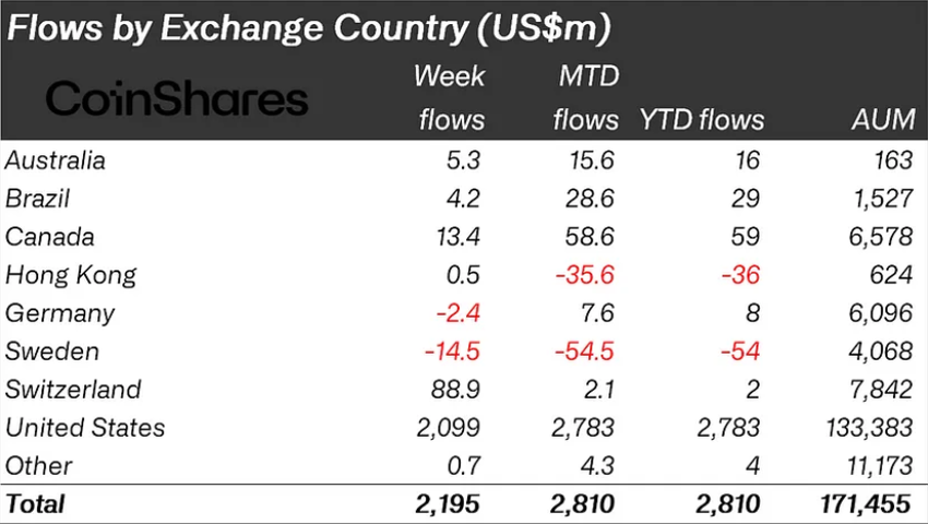 Además, Estados Unidos representó la mayor parte de las entradas, con una contribución de 2,000 millones de dólares. Sin embargo, otras regiones también registraron una actividad notable: Suiza y Canadá registraron 89 y 13 millones de dólares, respectivamente.