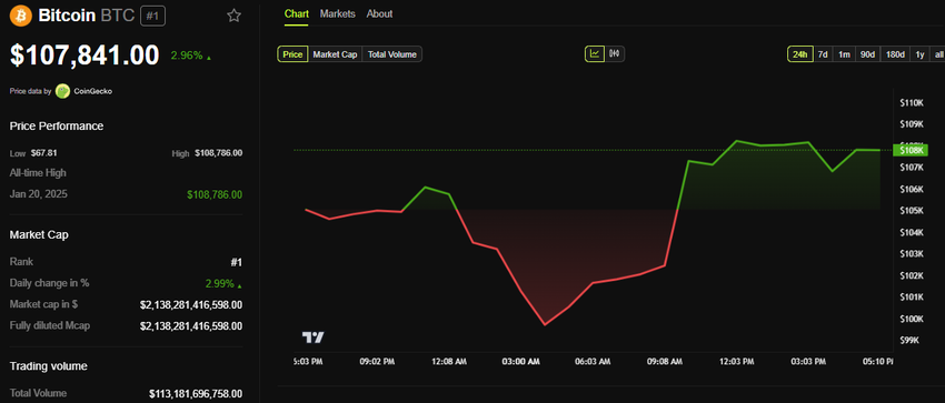 Al momento de escribir este artículo, Bitcoin se cotizaba a 107,841 dólares. Esto representa un aumento modesto de casi el 3% desde la apertura de la sesión del lunes y sigue al reciente máximo histórico de BTC de 109,588 dólares en Binance.
