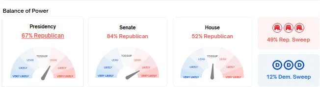 Según datos del mercado de predicción Polymarket, los Republicanos están mostrando fuerza en varios de estos estados clave en las métricas de balance de poder, lo que podría amplificar aún más las entradas de inversión en criptoactivos si esta tendencia continúa.