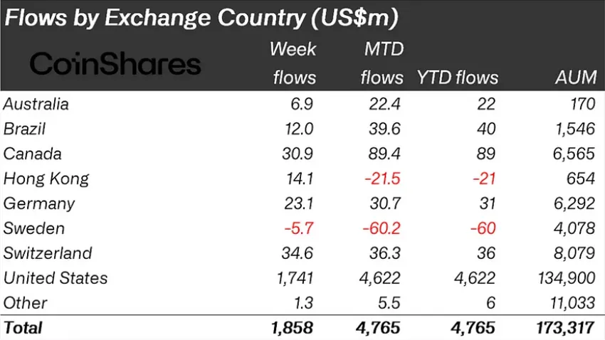 En este contexto, James Butterfill de CoinShares destaca que Estados Unidos lideró la iniciativa, registrando entradas de 1,700 millones de dólares. Sin embargo, las órdenes ejecutivas han tenido un efecto dominó, impulsando el sentimiento en otras regiones. Canadá registró entradas de 31 millones de dólares, Suiza 35 millones y Alemania 23 millones, lo que refleja un optimismo generalizado.