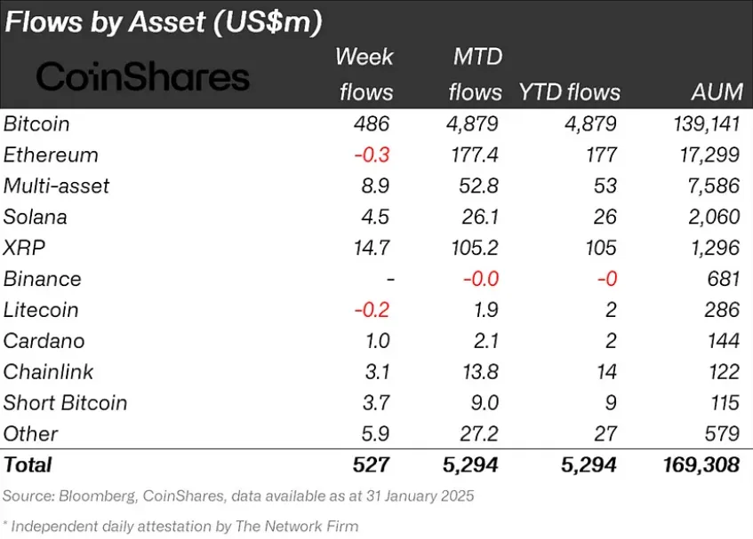 El último informe de CoinShares indica que las entradas de cripto solo alcanzaron 527 millones de dólares en la última semana de enero, reflejando la influencia de las tendencias del mercado más amplias en el sentimiento de los inversores. Marca una desviación notable de lo que se vio durante las semanas anteriores.