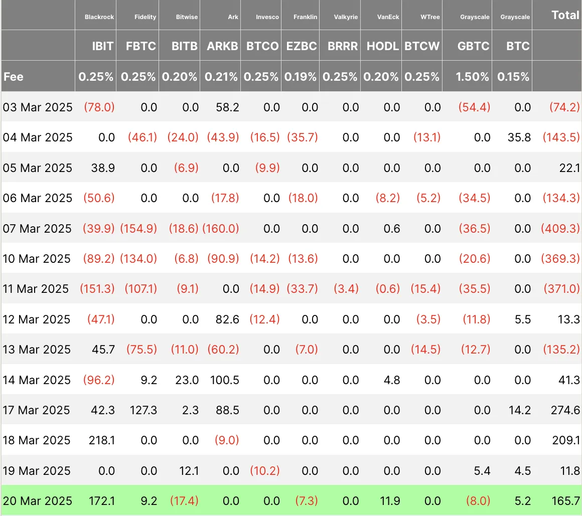 Según los últimos datos, la entrada neta total diaria alcanzó los 165,7 millones de dólares el 20 de marzo. Sin embargo, este crecimiento fue desigual entre los 11 ETF.