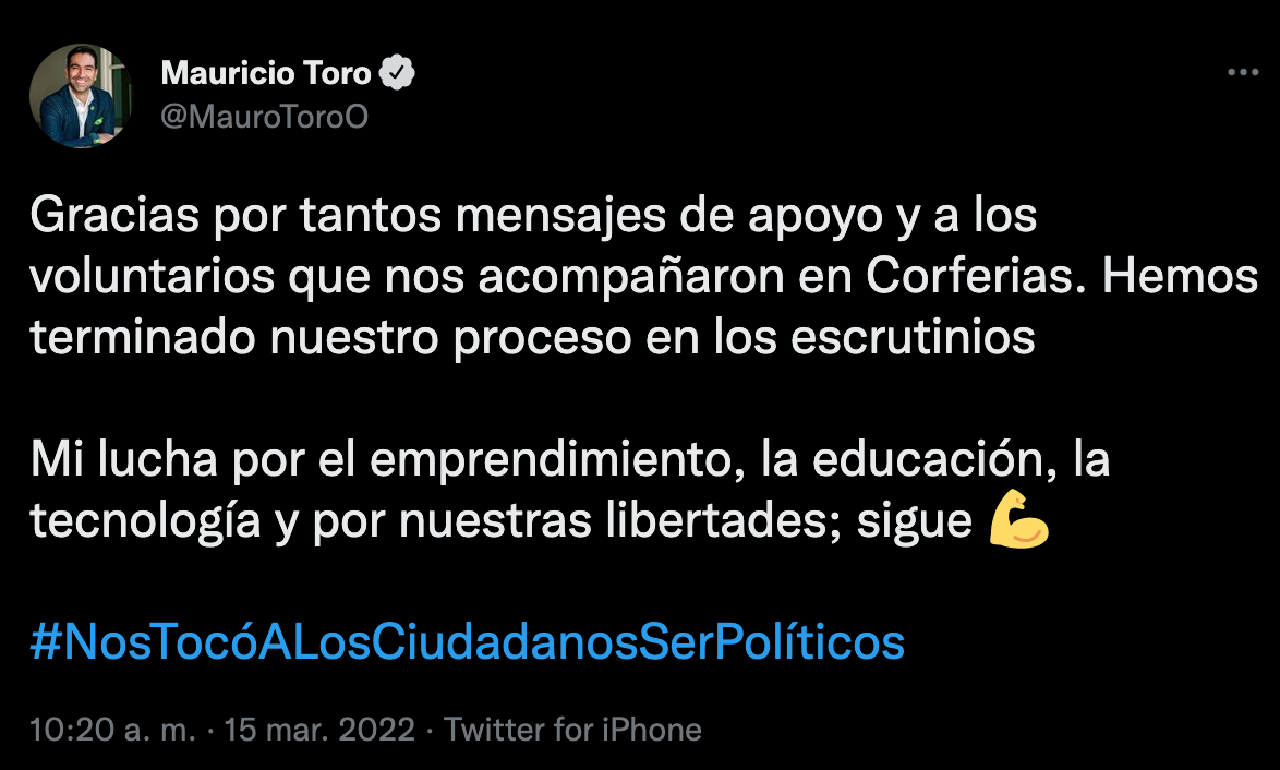 Actualmente Mauricio Toro se encuentra finalizando su periodo en el cargo de Representante a la Cámara, y aunque quiso optar por la reelección, en esta oportunidad no obtuvo el porcentaje necesario para continuar en su cargo. Sin embargo, Toro aseguró que continuará luchando por el emprendimiento, la educación, la tecnología y las libertades de los colombianos.