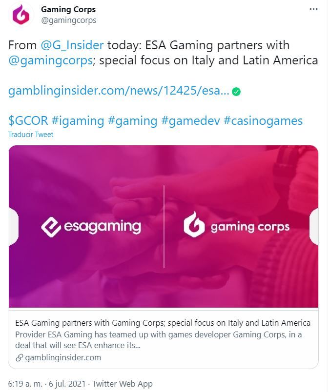 “Con un enfoque en el desarrollo de contenido original que atraiga a una amplia demografía de jugadores, Gaming Corps es el socio perfecto para nosotros mientras continuamos expandiendo nuestra plataforma de agregación para brindarles a los operadores una oferta premium”.