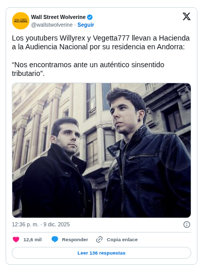 La obligación de tributar en España ha colocado a Willyrex y Vegetta777 en el centro de un debate legal que trasciende el ámbito digital. Ambos creadores han decidido recurrir ante la Audiencia Nacional las resoluciones del TEAC que les exigen pagar impuestos en España por los ejercicios 2016 y 2017, a pesar de que, según su defensa, ya residían oficialmente en Andorra durante ese periodo.