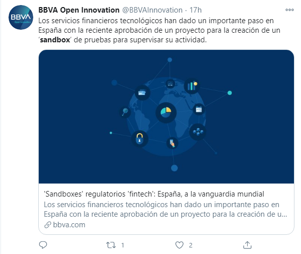 De acuerdo a una nota de prensa publicada en la página web del BBVA, la entidad bancaria realiza una valoración positiva de la reciente aprobación de un proyecto de sandbox que permita supervisar la actividad de las empresas FinTech en España.