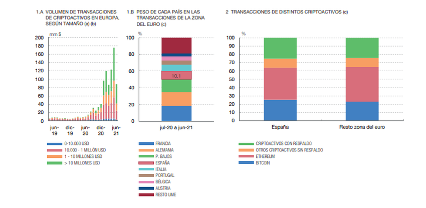 El Banco de España señaló en su informe que el volumen transaccional de criptomonedas en España casi alcanzó los 60 mil millones de euros durante el 2021 (4,8% del PIB, 2,7% de los activos financieros totales). Situándose de esta manera detrás de Reino Unido, Francia, Alemania y Países Bajos, y por delante de Suiza e Italia.
