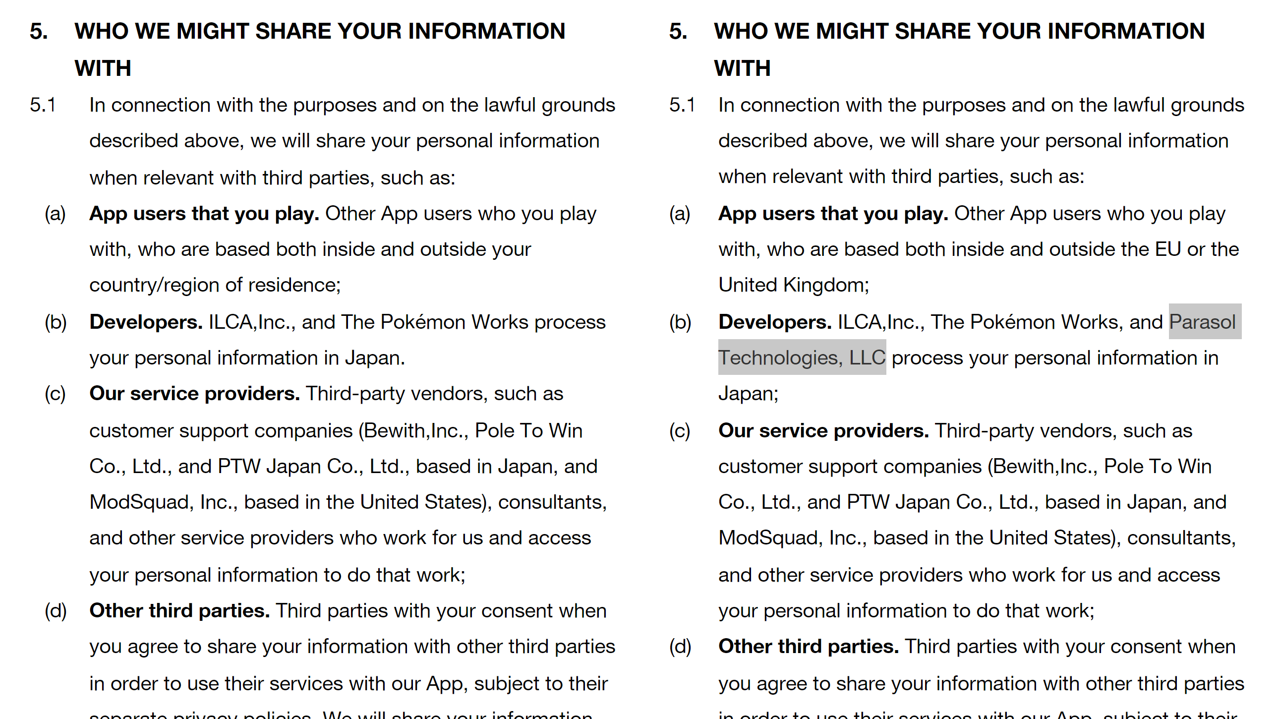 Las versiones en japonés y chino continúan listando a ILCA y The Pokémon Works como los únicos desarrolladores. Mientras tanto, la actualización de la política de privacidad de Corea designa a Parasol como un fideicomisario de datos en el extranjero.