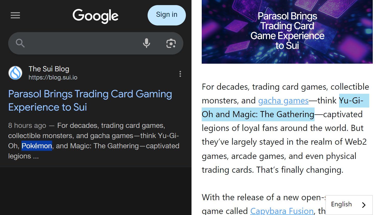 Sponsored SponsoredEso no es todo. En una reciente publicación de blog, la Fundación Sui detalló la última iniciativa de Parasol para integrar juegos de cartas coleccionables con NFT basados en blockchain.