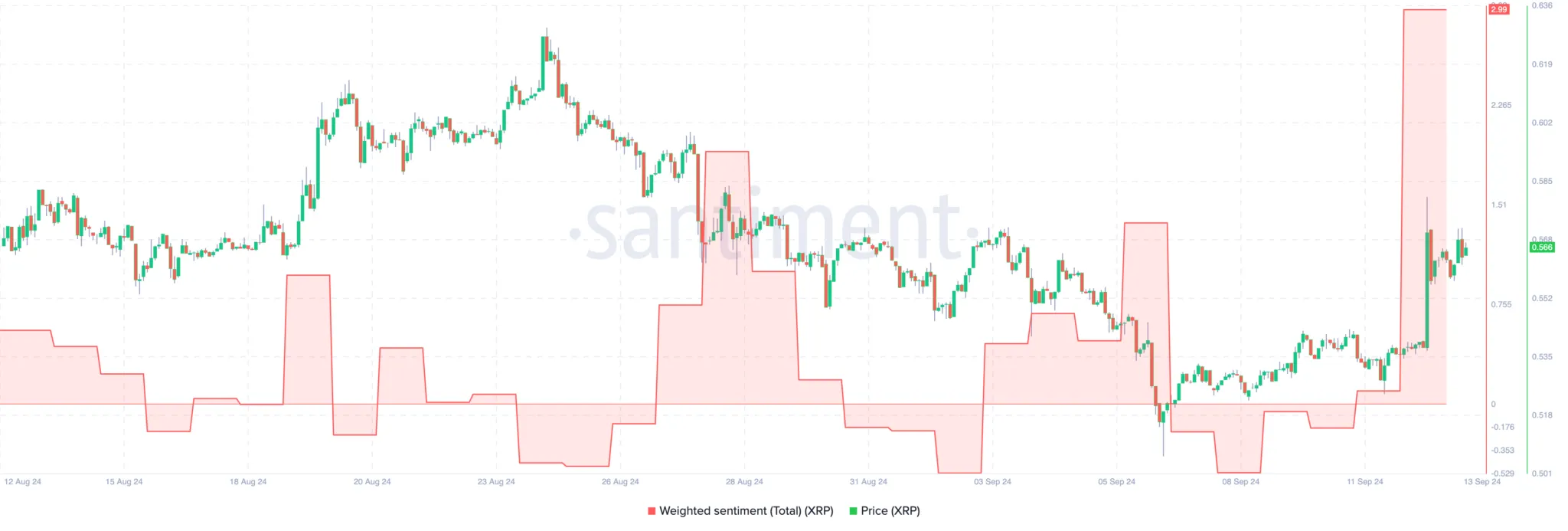 SponsoredAunque el precio se ha estabilizado en 0,56 dólares, los datos on-chain de Santiment revelan un aumento significativo en el Sentimiento Ponderado, alcanzando su nivel más alto en más de un mes. El Sentimiento Ponderado rastrea el volumen social para evaluar si el mercado está alcista o bajista sobre un proyecto.