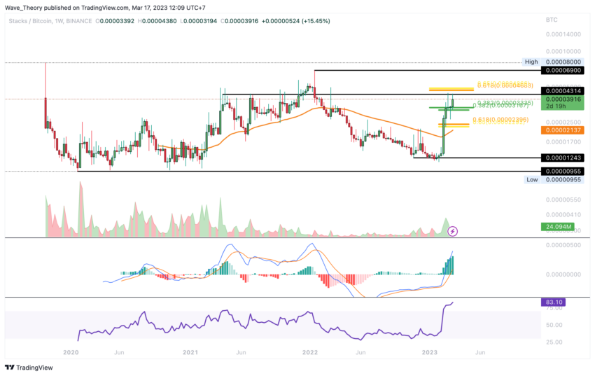 De lo contrario, la resistencia significativa de la proporción áurea todavía está esperando alrededor de 0.000047 BTC. Si se rompe, el precio de Stacks está en un nuevo ciclo alcista frente a BTC.