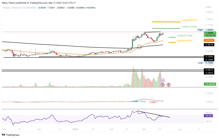 El precio de Stacks (STX) pronto encontrará una resistencia significativa. El nivel de Fibonacci de 0.382 o una resistencia significativa de la proporción áurea que se encuentra entre 1.35 dólares y 2.1 dólares, está a la espera.