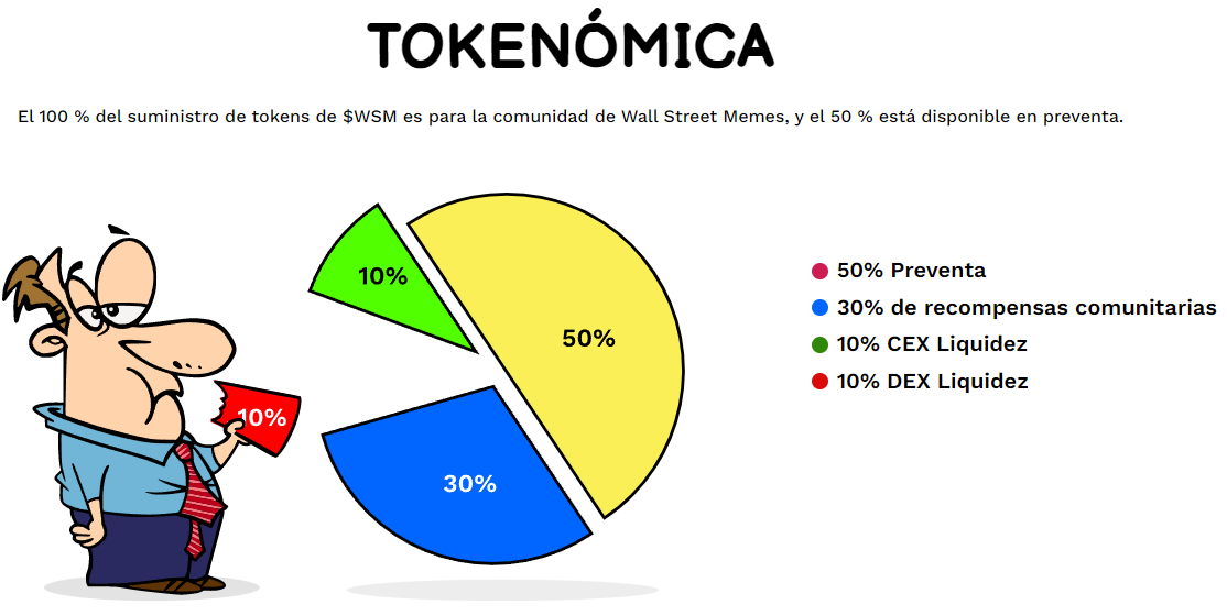 “De acuerdo con su espíritu democratizador, el 100 % del suministro de tokens es para la comunidad de Wall Street Memes: no hay ventas privadas entre bastidores ni generosidad en la asignación de equipos (…) Como consecuencia, el 50 % del suministro de tokens está disponible en las distintas etapas de la preventa; 30 % como recompensas comunitarias; 10 % para liquidez CEX y 10 % para liquidez DEX”.