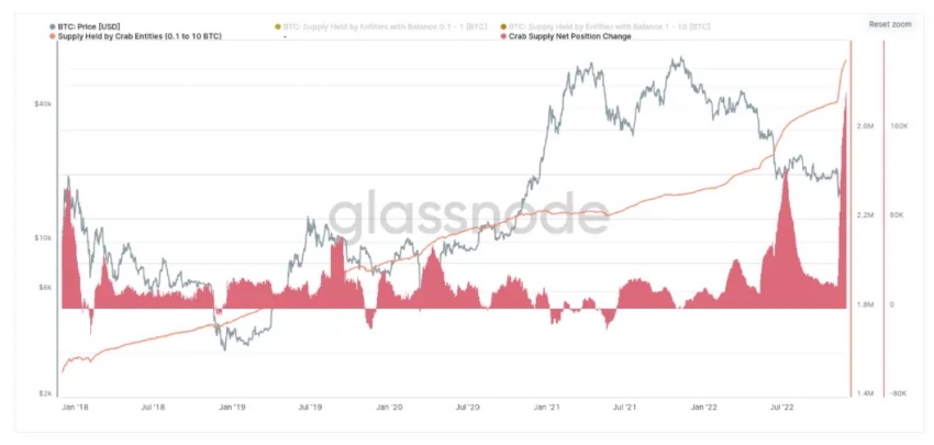Los inversores con cantidades menores de fondos en sus cuentas hacen lo mismo. Por ejemplo, los monederos de los “camarones” que tienen menos de 10 BTC han acumulado 191,600 BTC en los últimos treinta días con un valor total de más de 3,100 millones de dólares.
