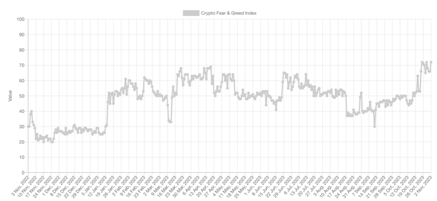 Según Alternative, el 6 de noviembre, el llamado índice Bitcoin Fear and Greed subió a 74 puntos sobre 100. Este es su valor récord en más de un año, lo que es una clara señal de optimismo entre inversores y traders.