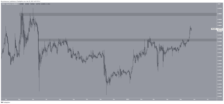 El precio de TRX ha estado aumentando desde el 11 de marzo. Si bien el precio inicialmente tuvo problemas para despejar el área de 0.071 dólares, finalmente logró hacerlo el 20 de mayo.