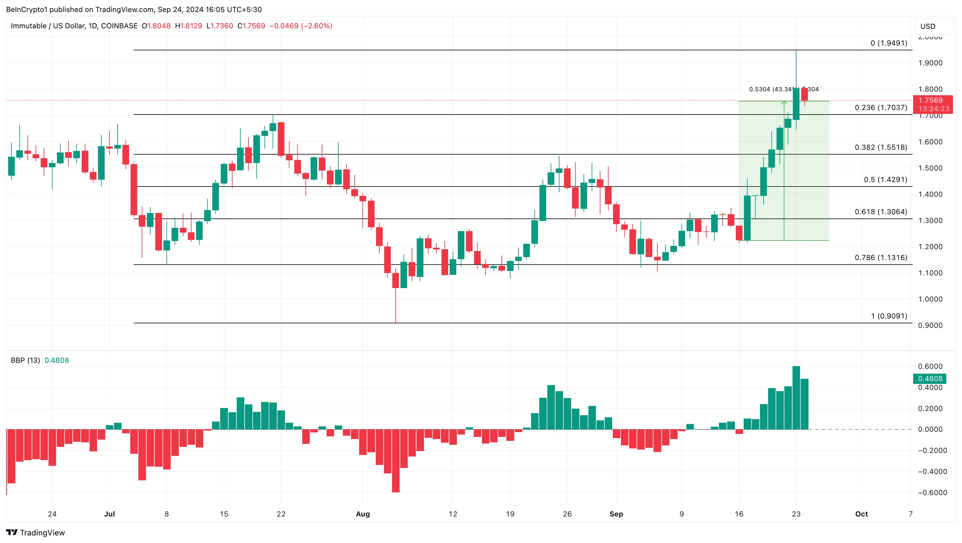Sponsored SponsoredEl Poder de los Toros y Osos (BBP) en el gráfico diario indica que los alcistas están preparados para impulsar IMX hacia arriba una vez más. Si se valida, el valor de la criptomoneda podría subir a 1,95 dólares.