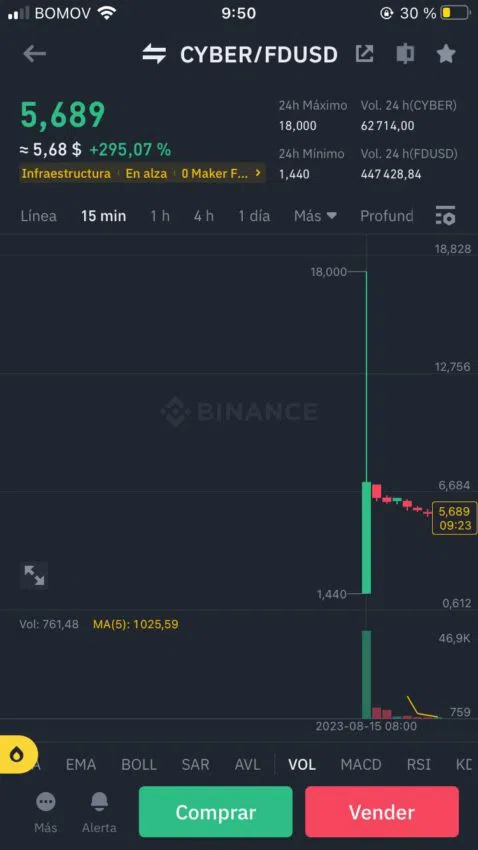 La cotización de Cyber, que tuvo lugar hace aproximadamente dos horas en el momento de escribir este artículo, hizo que el activo subiera 295%. Después de una mecha impresionante de 18 dólares, el token volvió a caer a 5,68 dólares.