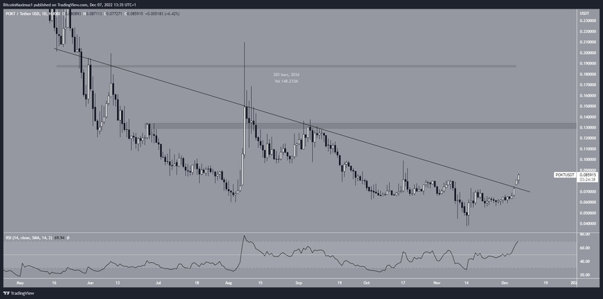 A pesar de la caída en el resto del mercado cripto, el precio de POKT ha aumentado desde entonces. Salió de la línea de resistencia el 6 de diciembre. La ruptura se combinó con una ruptura del RSI por encima de 50, aumentando su legitimidad. En el momento de la ruptura, la línea había estado activa durante 203 días.