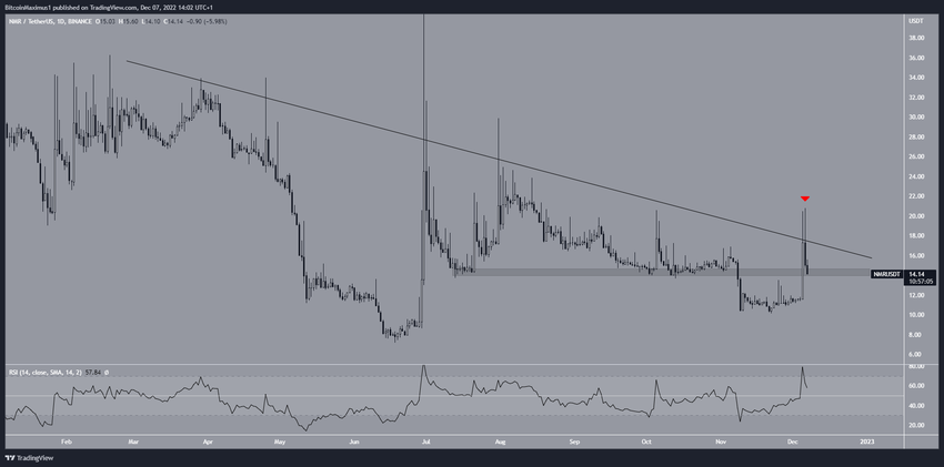 El precio de NMR cayó por debajo de una línea de resistencia descendente desde finales de marzo. La línea provocó numerosos rechazos hasta el momento, el más reciente el 6 de diciembre (icono rojo). NMR ha caído en las últimas 24 horas tras ser rechazado por la línea de resistencia (icono rojo).