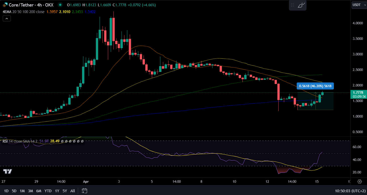 CORE alcanzó recientemente un máximo de un año de 4.37 dólares el 2 de abril, antes de que el precio cayera un 72,5%. Desde entonces, el precio ha experimentado una impresionante recuperación en las últimas 24 horas.