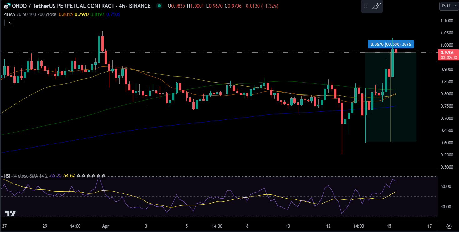 El gráfico de precios de ONDO revela un aumento del 60%, con las últimas velas formando una configuración alcista. Esto viene de un dramático descenso del 47% desde que alcanzó su máximo histórico el 31 de marzo.