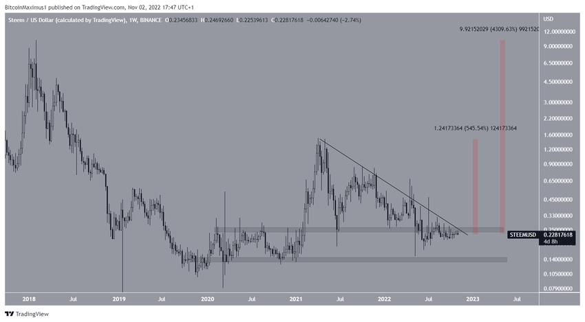 El precio de STEEM ha estado cayendo por debajo de una línea de resistencia descendente desde abril de 2021. Mientras lo hacía, también se desplomó por debajo del área horizontal de 0.25 dólares, que ahora actúa como resistencia. La confluencia de estas dos resistencias hace que sea poco probable que el precio de STEEM se dispare.