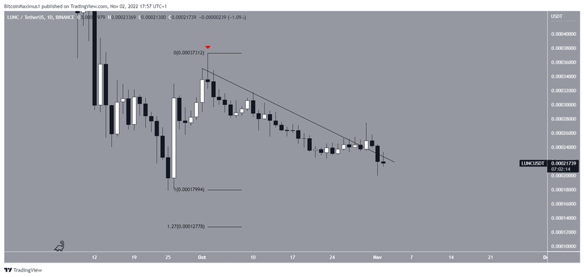 El precio de LUNC ha caído por debajo de una línea de resistencia descendente desde el 2 de octubre (icono rojo).