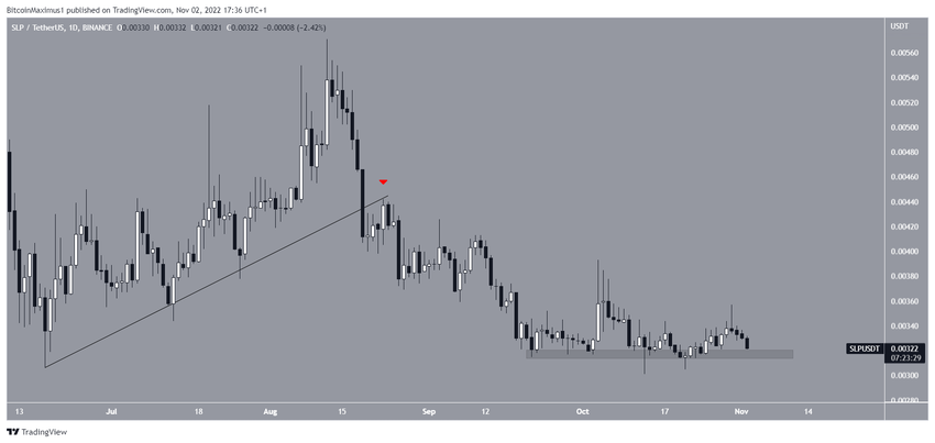 El precio de SLP ha estado cayendo desde que alcanzó un máximo de 0,0057 dólares el 12 de agosto. El movimiento a la baja provocó una ruptura de una línea de soporte ascendente el 19 de agosto, antes de que el precio lo validara como resistencia cuatro días después (icono rojo).