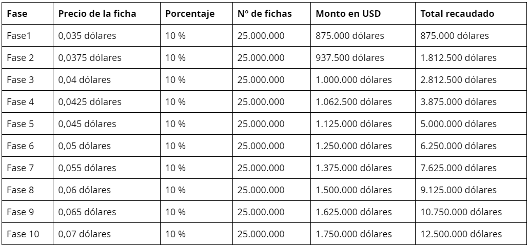 A continuación, detallaremos cómo ha sido diseñada la preventa de esta activo que tiene anclado su precio a un sistema deflacionario que obliga al token a subir sus números cada que consiga un hito de recaudación.