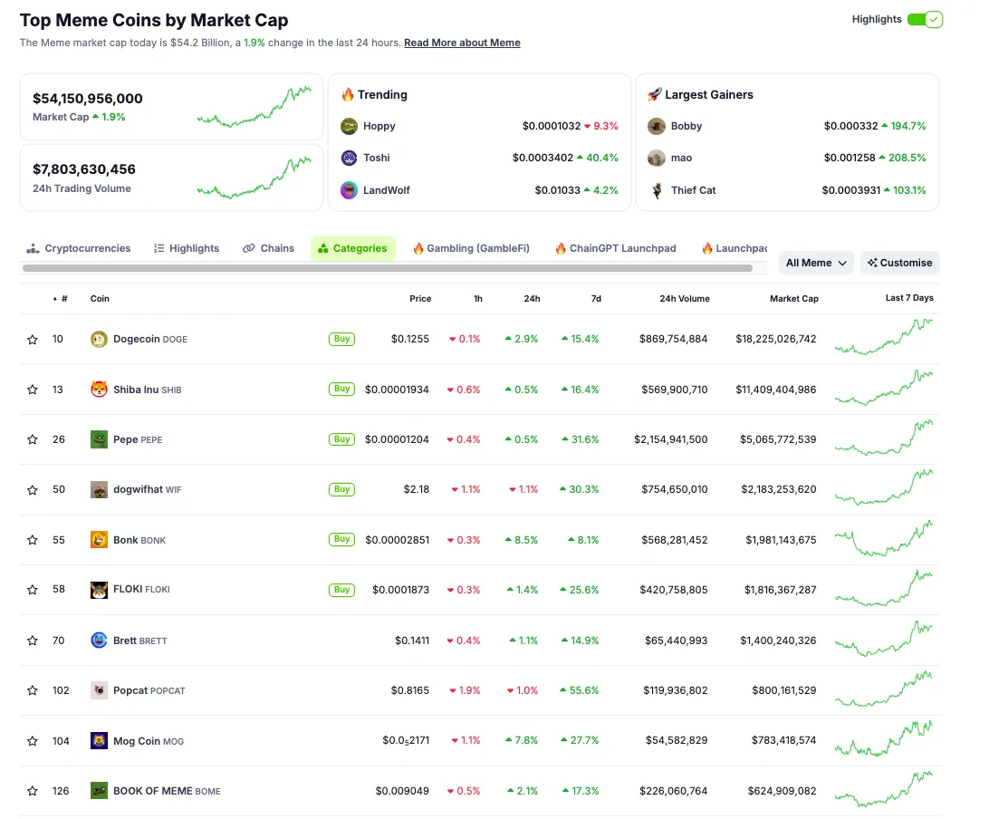 Las memecoins han surgido como campeonas, superando a muchas altcoins en medio de una recuperación general del mercado. Según CoinGecko, la capitalización de mercado total para las memecoins ahora se sitúa en unos impresionantes 54.15 mil millones de dólares.