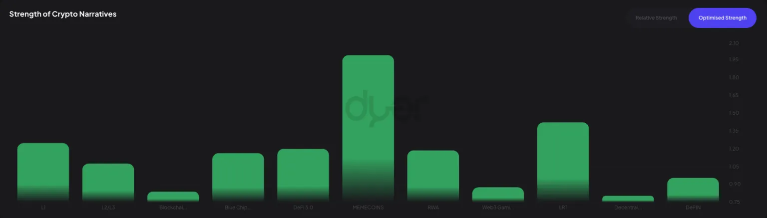 De manera similar, Dogwifhat (WIF) también está avanzando, con un aumento de más del 30% en la última semana. Datos de la plataforma de análisis on-chain DYOR confirman que las memecoins han sido recientemente las narrativas cripto más fuertes: