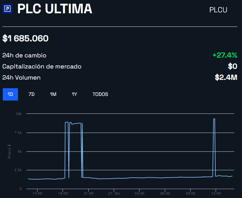 El día de hoy, PLC Ultima subió hasta los 9,337 dólares, antes de regresar nuevamente a los 1,700 dólares, precio en el que se ubica actualmente, según los datos de BeInCrypto.