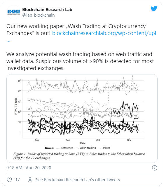 Las investigaciones también infirieron que el 96-98% del volumen de comercio de ETH en los exchanges acusados de falsificar resultados era sospechoso. El análisis de los saldos de los tokens en comparación con el volumen de trading también sugirió que el 72-97% del volumen podría haberse falsificado.