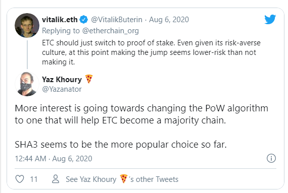 Es comprensible que la gente de la comunidad quiera que se haga algo. En respuesta a un tweet de Bitfly sobre el ataque del miércoles, el fundador de Ethereum, Vitalik Buterin, sugirió un cambio de ETC a un algoritmo de consenso de Proof of Stake (PoS).