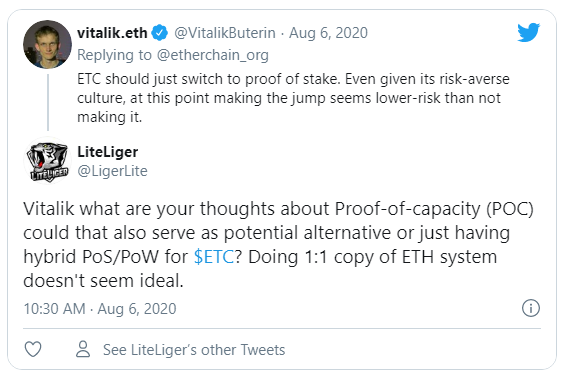 SponsoredAlternativamente, el usuario de Twitter @LigerLite señaló que una PoS en Ethereum Classic sería como la cadena principal Ethereum.