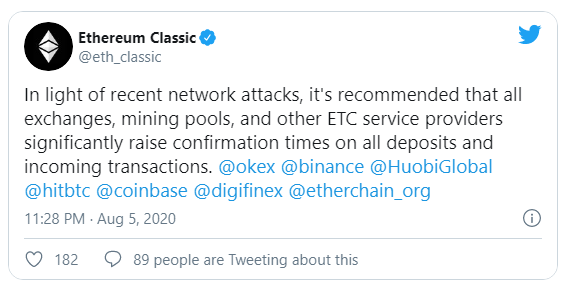 La cuenta oficial de Twitter de Ethereum Classic instó a los exchanges a aumentar los tiempos de confirmación en respuesta a este ataque. Binance congeló los depósitos y retiros de ETC.