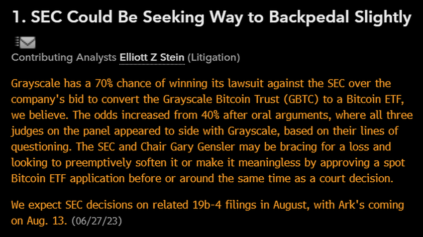 Además, Stein aumentó las probabilidades del 40% en base a los argumentos orales de tres jueces que parecían estar del lado de Grayscale.