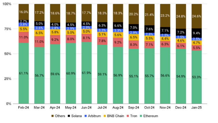 En el ecosistema DeFi, Solana ha mantenido su dominio sobre Ethereum en volumen de intercambios descentralizados (DEX) desde octubre de 2024. Solo en enero, se alcanzó un volumen 200% mayor que el de Ethereum y un máximo histórico en la relación de volumen Solana-Ethereum del 300%.