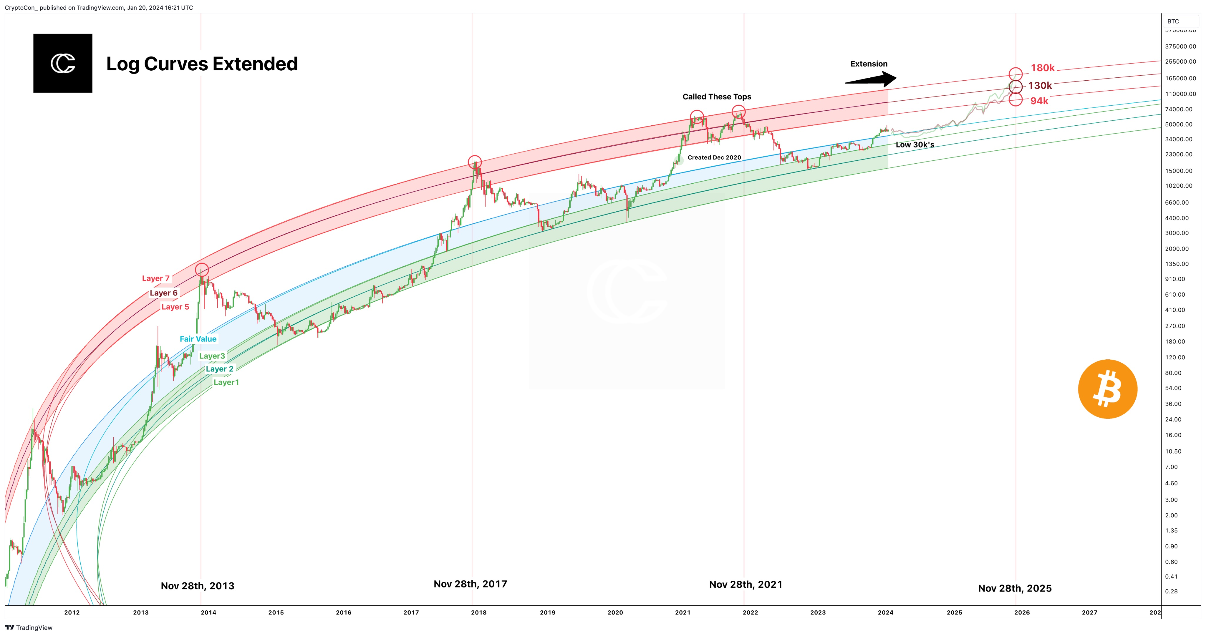 “Por la fecha de la Teoría de los Ciclos Halving de +/- 21 días a partir del 28 de noviembre de 2025, aquí están los precios de las 3 bandas superiores: Capa 7: 180k. Capa 6: 130k. Capa 5: 94k. El precio de la capa 6 de 130k se alinea con alrededor de otros 5 experimentos de precios que he realizado para la parte superior del ciclo”.