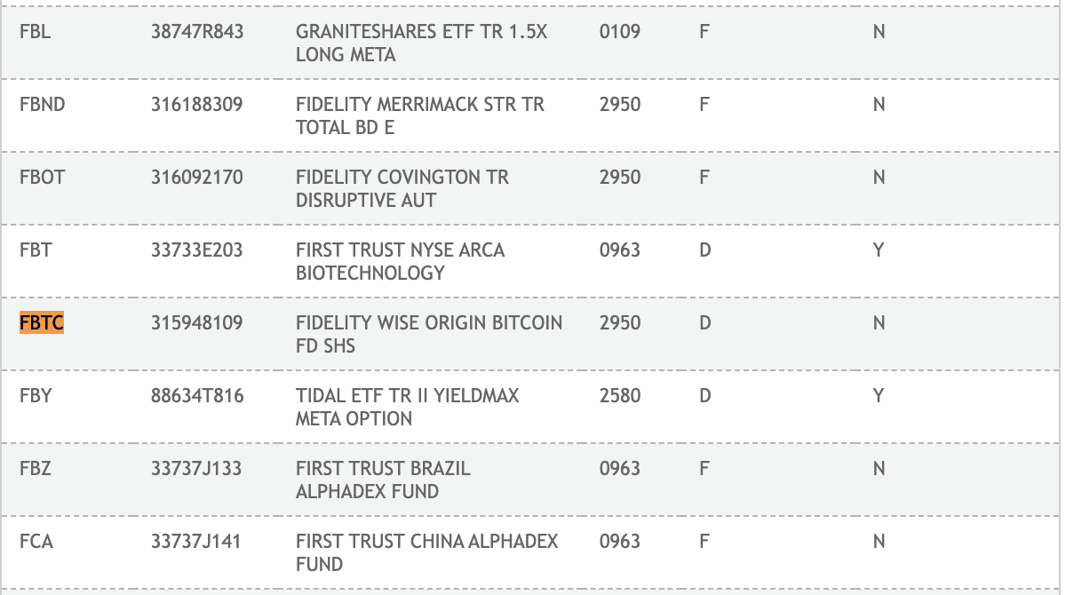 El ETF spot de Bitcoin de Fidelity está listado en el DTCC como FBTC con el número “315948109” como Fidelity Wise Origin Bitcoin FD SHS. Además, se listó en el depository trust semanas antes de que la SEC comience a aprobar los ETF spot de Bitcoin de los gestores de fondo.