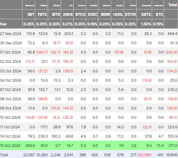 Mientras tanto, BlackRock sigue a la vanguardia de esta ola de interés institucional por las inversiones en Bitcoin. Junto con Fidelity, los dos gestores de activos atrajeron conjuntamente casi 760 millones de dólares en los últimos tres días, según muestran los datos de Farside. El martes 15 de octubre, BlackRock lideró las entradas, registrando hasta 288,8 millones de dólares en flujos positivos.
