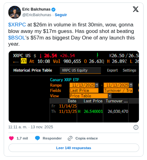El 13 de noviembre de 2025, XRPC abrió en Nasdaq en medio de gran expectativa, alcanzando 26 millones de dólares transaccionados en media hora: un desempeño excepcional para una ETFde criptomonedas en su debut.