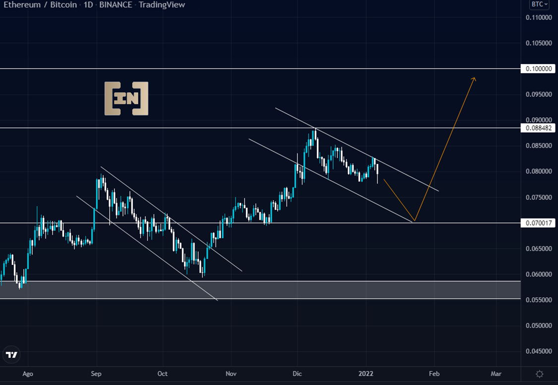 Buscando patrones similares, se evidencia el canal secundario marcado entre septiembre y octubre del 2021, lo que sugiere la continuidad bajista hasta inicios de febrero. El rechazo debe ser fuerte y con volumen grande sobre los 0.07 BTC proyectando la continuidad alcista en los 0.1 BTC.