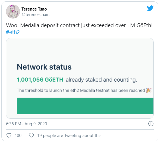 Según el Launchpad oficial de Medalla, se ha realizado el staking de más de un millón de GöETH (ETH simulado para la red de prueba de Göerli).