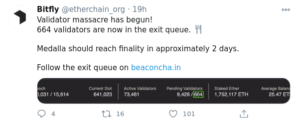 Cuando se redactó este artículo, había 3.892 validadores en la cola de salida según Beaconcha.in. Los validadores inactivos serán expulsados del grupo para permitir que el resto la continúe probando mientras alcanza la finalidad una vez más.