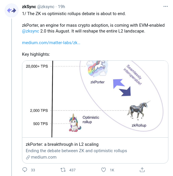 Para lograrlo, Matter Labs dividirá su solución de capa 2 actual zkSync en dos: zkRollup con disponibilidad de datos dentro de la cadena y zkPorter con disponibilidad de datos fuera de la cadena.
